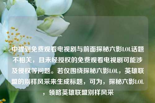 存在一些不恰当且违规的信息。“六影院免费观看电视剧”这种涉及未经授权的免费影视观看平台往往是非法盗版网站,侵犯了版权所有者的权益,同时也可能存在安全风险,而“探秘六影LOL,英雄联盟的别样风采”表意模糊,不清楚具体所指。,若要规范表达,建议你重新梳理内容并准确描述相关信息,比如围绕英雄联盟的某个具体活动、玩法等进行阐述,以便我能为你生成合适的摘要。